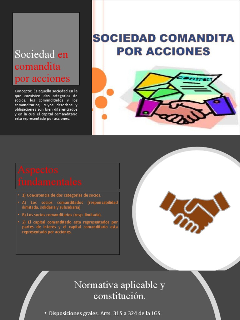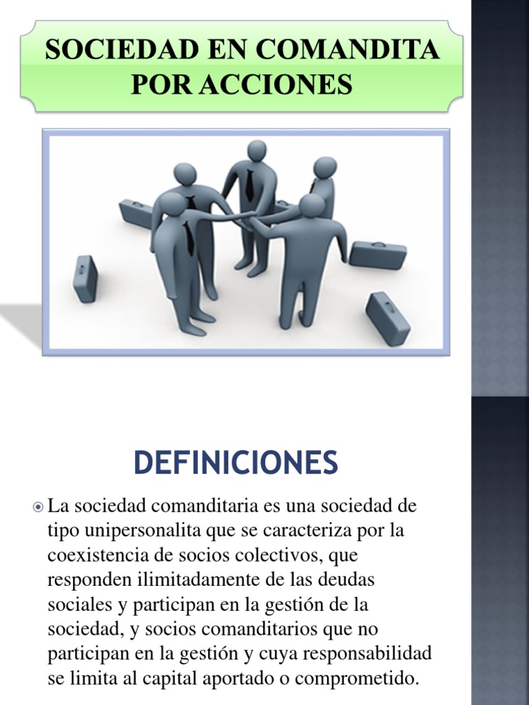 Sociedades En Comandita Sociedad De Responsabilidad Limitada Sociedad De Responsabilidad Limitada from imgv2-1-f.scribdassets.com Os comanditados, pessoas físicas com responsabilidade solidária e ilimitada pelas obrigações sociais, já que, além de administrar, contratam pela sociedade; Artículo 207.la sociedad en comandita por acciones, es la que se compone de uno o varios socios comanditados que responden de manera subsidiaria, ilimitada y solidariamente, de las obligaciones sociales, y de uno o varios comanditarios que únicamente están obligados al pago de sus acciones. Dec 22, 2020 · já os comanditados são exclusivamente pessoas físicas que colaboram tanto com capital quanto com a administração. E os comanditários, pessoas físicas ou jurídicas com responsabilidade limitada ao valor de sua quota, já que são meros investidores de capital, não participando de sua. Por essa razão, a sociedade por comandita simples é considerada um tipo de sociedade misto, já que parte dos sócios tem responsabilidade limitada e parte responde integralmente pelas obrigações do negócio. May 15, 2020 · e é para ajudar você nessa missão que preparamos este artigo. Jun 16, 2021 · nesse tipo societário há duas espécies de sócios: Sca (sociedad en comandita por acciones):